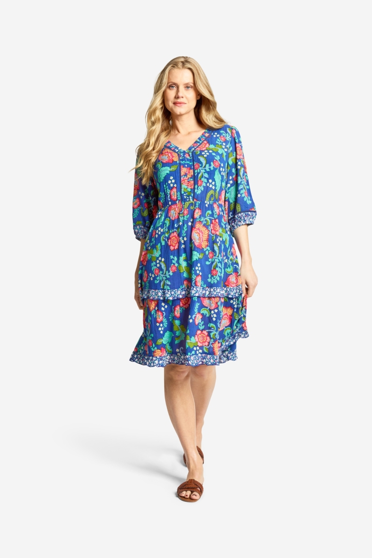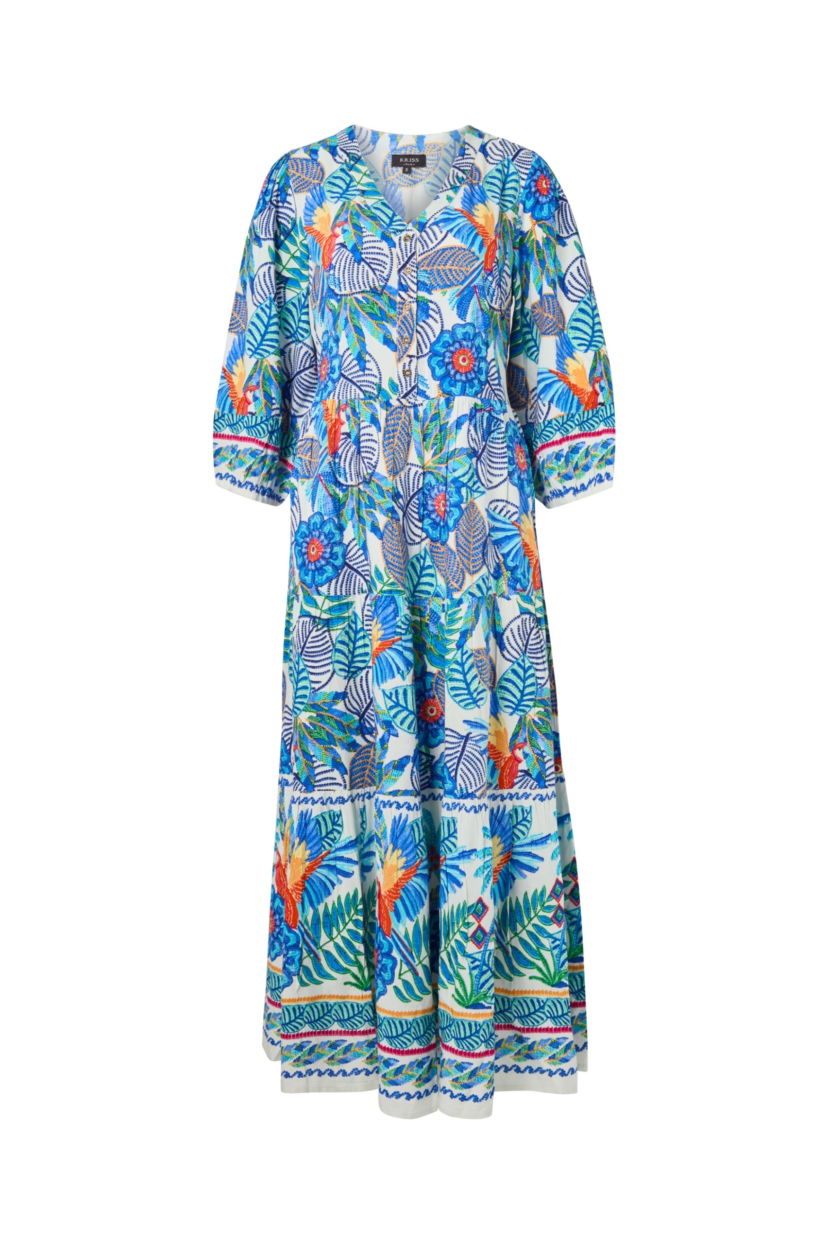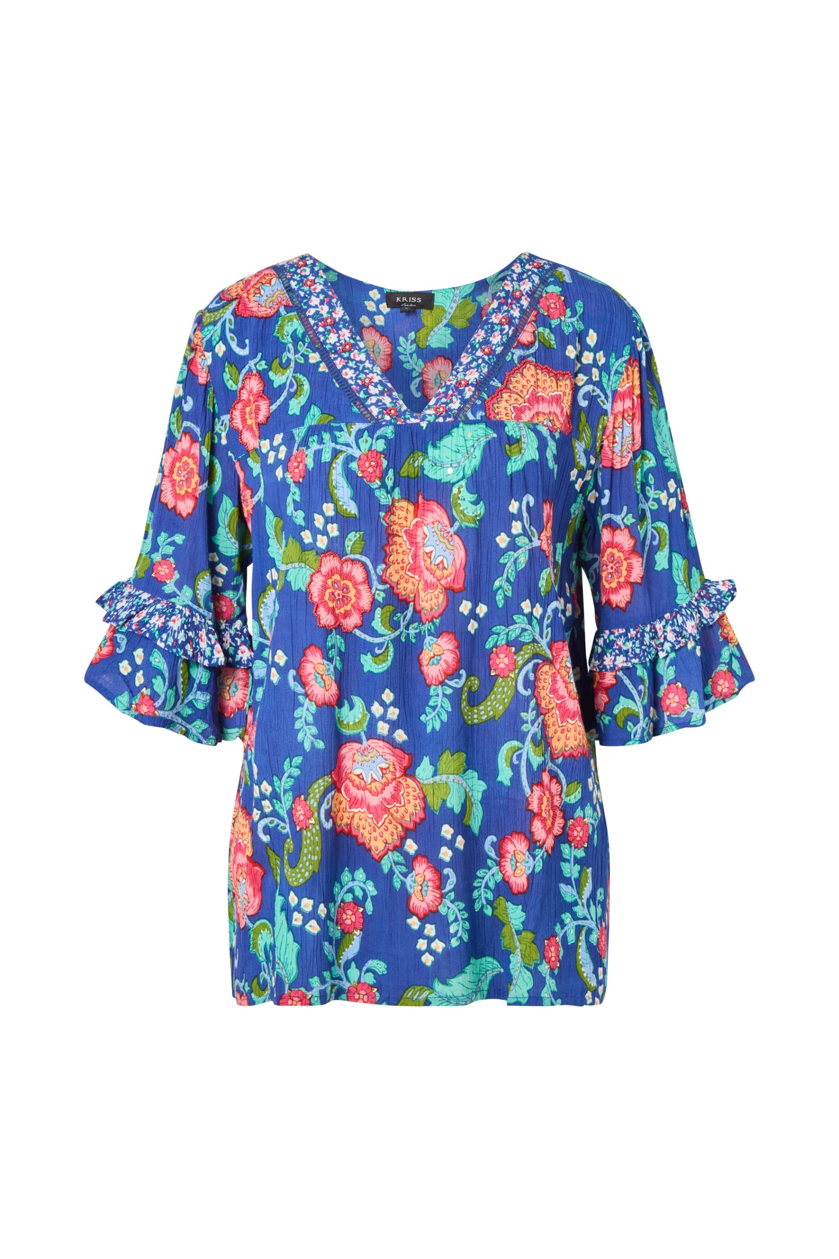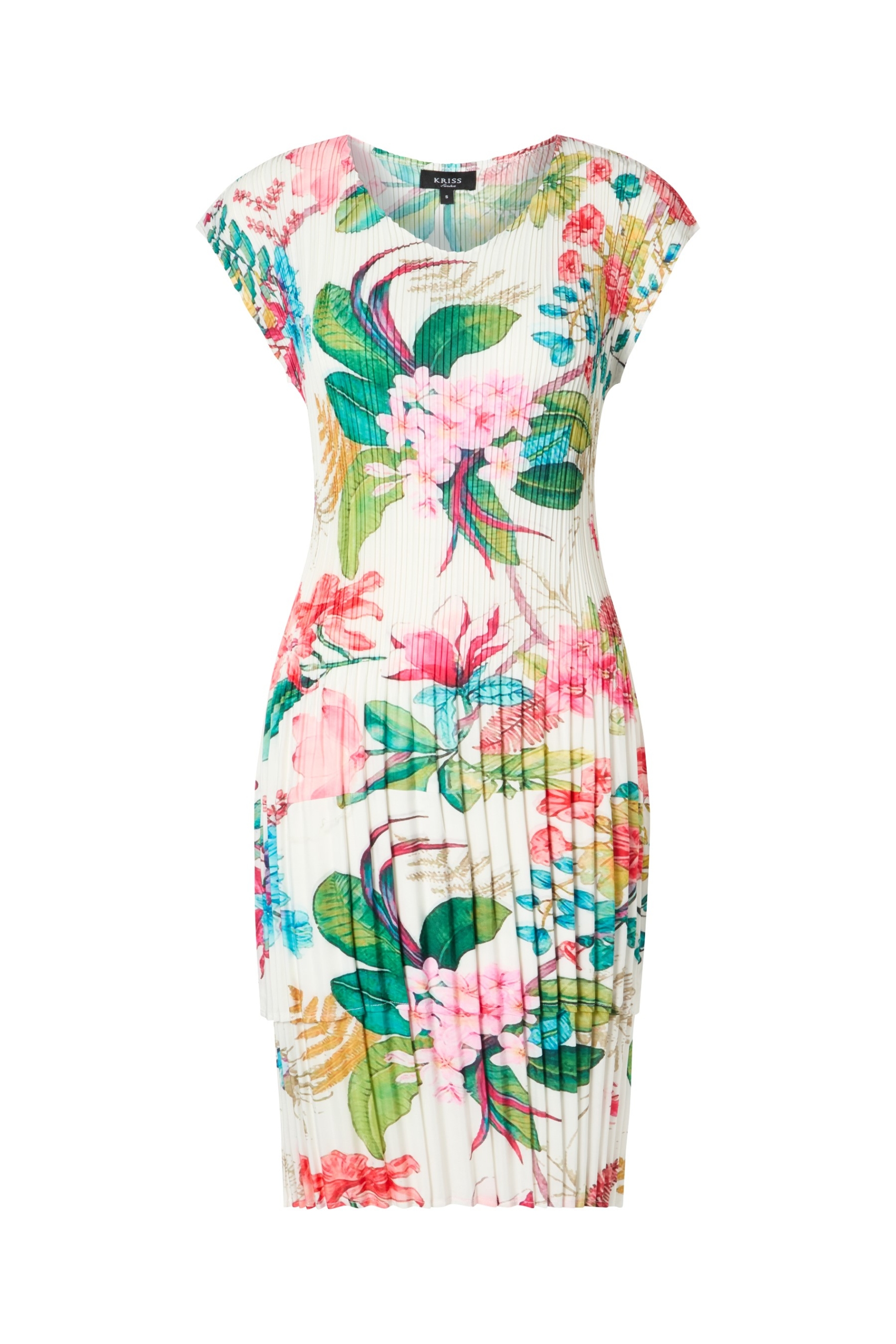 Vårlig tunika med placerat print i vackert utförande. Plisserad kvalitet med en tätare plissering runt byst och liv och en lättare plissering nertill. Lång ärm med ett plisserat parti på överärmen och en knappslejf som formar och lyfter ärmen med ett knäpp. Ståkrage med klädsam V-ringning, och stängning med dekorativa knappar. Den totala längden i storlek S är 76,5 cm från den högsta punkten. Modellen på bilden är 178 cm lång.