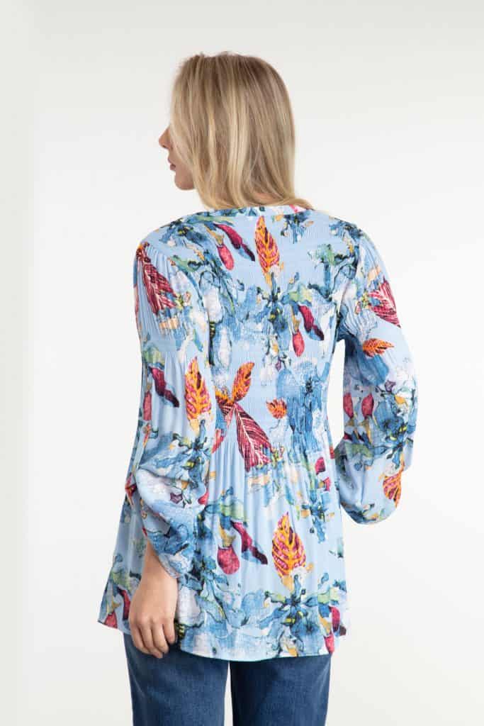 Vårsnygg tunika med stormönstrat print i ljusblått på återvunnen polyester. Krinklad kvalitet med en tätare plissering runt byst och liv och en lättare plissering nertill vilket ger tunikan ett snyggt fall runt stussen. Lång ärm med ett plisserat parti på överärmen och en knappslejf som formar och lyfter ärmen med ett knäpp. Liten ståkrage med en spetskant upptill och klädsam V-ringning. Modellen är genomknäppt med metall knappar. Den totala längden i storlek S är 78 cm från den högsta punken.