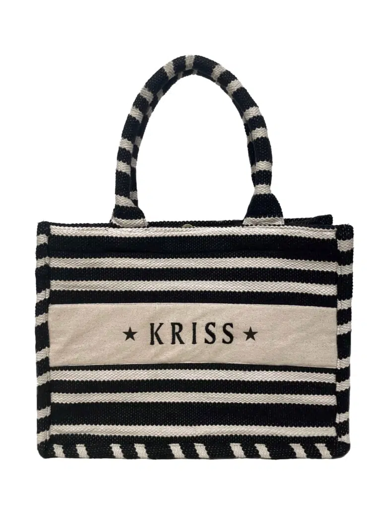 Unik väska i randig väv med KRISS-logga på ena sidan. Smidigt foder i svart på insidan, innerficka med blixtlås och en magnetisk knapp till stängning. Två rejäla handtag.